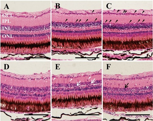Representative images of H&E staining of adult zebrafish retinas after MNU exposure. Each group of zebrafish was exposed to MNU for 60 min and thereafter maintained under standard conditions for 6 hr, 24 hr, 3 days, 5 days and 8 days, respectively. (A) Vehicle control; (B) Six hr of maintenance after exposure, the pyknotic cells (black arrowheads) started to appear in the INL and the GCL; (C) Twenty four hr of maintenance after exposure, the number of pyknotic cells increased (black arrowheads); (D) Three days of maintenance after exposure, obscuration of retinal structure between the INL and the ONL was observed; (E) Five days of maintenance after exposure, some parts of the INL were fused with the ONL (white arrow); (F) Eight days of maintenance after exposure, accumulation of cell clusters was observed in the INL (black arrow) and cells appeared in the INL (white arrowheads). GCL: ganglion cell layer; IPL: inner plexiform layer; INL: inner nuclear layer; ONL: outer nuclear layer. Scale bars indicate 100 µm. |