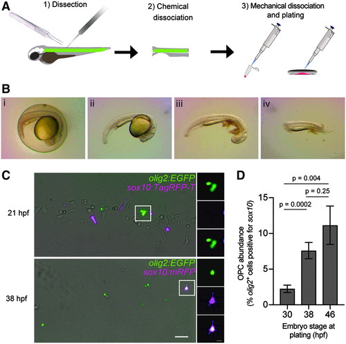 Primary culture of zebrafish OPCs. (A) Overview of approach for primary culture from 18 to 60 hpf transgenic embryos. (B) Dissection technique to culture spinal cord tissue proceeds from dechorionation (i→ii), to yolk removal (ii→iii), and is completed with anterior- and posterior-most segment removal (iii→iv). Anterior: right; dorsal: top. (C) Culture of Tg(sox10:TagRFP-T)/Tg(olig2:EGFP) embryos at 21 hpf and Tg(sox10:mRFP)/Tg(olig2:EGFP) double transgenic embryos at 38 hpf. Scale bars = 50 and 10 μm (inset). (D) Plot of percent olig2+ cells specified as OPCs identified by coexpression of sox10 based upon time of culture. N30 hpf = 14 dishes; N38 hpf = 13 dishes; N46 hpf = 11 dishes; with at least 8 nonadjacent fields counted per dish. Bars show mean ± SEM. One-way ANOVA, White's method. ANOVA, analysis of variance; OPCs, oligodendrocyte progenitor cells; SEM, standard error of the mean; hpf, hours postfertilization. |