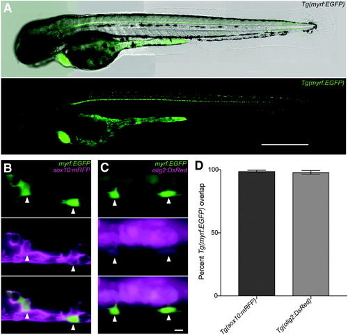 Tg(myrf:EGFP) is an oligodendrocyte-lineage-specific reporter in the zebrafish spinal cord. (A) Tg(myrf:EGFP) reporter expression at 75 hpf shows EGFP+ cells distributed in the ventral and dorsal spinal cord. Heart EGFP expression results from the myl7:EGFP transgenesis marker. High magnification confocal images of (B) Tg(myrf:EGFP)/Tg(sox10:mRFP) and (C) Tg(myrf:EGFP)/Tg(olig2:DsRed) double transgenic embryos at 48 hpf. Scale bars = 500 μm (A) and 5 μm (B, C). (D) Plot of overlap between Tg(myrf:EGFP) and established OPC reporters. Nsox10 = 11 fish, nsox10 = 108 cells; Nolig2 = 13 fish, nolig2 = 88 cells. Bars show mean ± SEM. For (B, C) imaging performed at somite 6. |