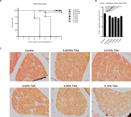 Thioacetamide titration in zebrafish embryos. Zebrafish embryos (2dpf) were treated until 8dpf with different concentrations of TAA in egg water. (A) Survival of the embryos during TAA treatment (N = 50 embryos). (B) At 8dpf the embryos were imaged to measure the sizes of the liver and total embryo in order to calculate the liver to embryo size ratio (N = 2, ±SEM). (C) Sirius-red stained section of TAA treated zebrafish embryo livers (8dpf, 400x magnification). *p ≤ **p ≤ 0.01, ***p ≤ 0.001. PHENOTYPE: