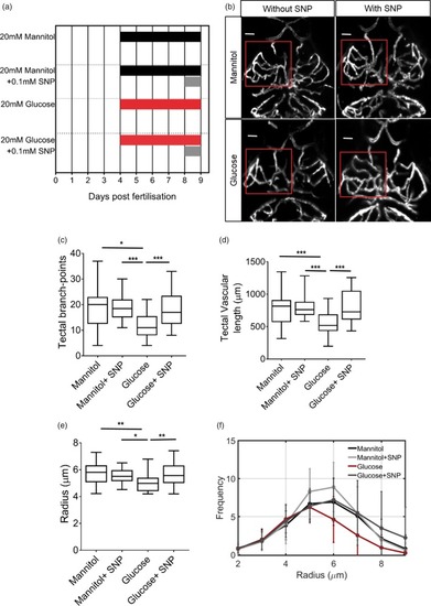 Sodium nitroprusside reverses the effect of glucose exposure on cerebrovascular patterning. (a) Gannt chart indicating treatment groups and duration of drugs exposures for experiments in PHENOTYPE: