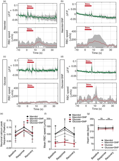 Sodium nitroprusside reverses the effect of glucose on neurovascular coupling. (a)–(d) Time series of neuronal activation ( PHENOTYPE: