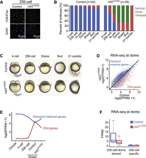 Maternal Depletion of Histone Acetyltransferases Impedes Zebrafish Embryonic Development (A) Immunofluorescence staining of H3K27ac in control and HATmTKD embryos at the 256-cell stage (STAR Methods). H3K27ac (green) and DNA (DAPI, blue) are shown. Embryos derived from oocytes injected with standard control MO via OMIS were used as controls. (B) Bar plots showing fractions of embryos that are normal, dead, or delayed in development at different developmental stages between control (left, injected with standard control MO) and HATmTKD (right) embryos (n, number of embryos). (C) Representative images of control (top) and HATmTKD (bottom) embryos across different developmental stages. The black arrowhead in the control dome embryo indicates the doming yolk syncytium, and black arrows indicate the spreading of the YSL (yolk syncytial layer) over the yolk (control embryo). The corresponding red arrowhead and arrows indicate that no such cell movements occur in the HATmTKD embryo. (D) Scatterplot comparing gene expression (log2[FPKM + 1]) between control and HATmTKD embryos at the dome stage. Red dots, non-maternal ZGA genes; blue dots, decayed maternal genes. (E) Distribution of average RNA levels for both non-maternal ZGA genes (red) and decayed maternal genes (blue) across different developmental stages, including both control and HATmTKD embryos at the dome stage. (F) A boxplot comparing RNA levels for 256-cell-dome shared genes (left) and 256-cell-specific genes (right) for control (blue) and HATmTKD (red) embryos. Genes with maternal expression (FPKM > 5 in oocyte, 4-cell or 256-cell) are excluded to avoid confounding effects. For 256-cell-dome shared genes, only those that show expression (FPKM > 3) in the wild-type (WT) at the dome stage are included for analysis. |