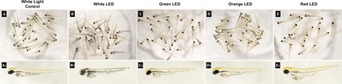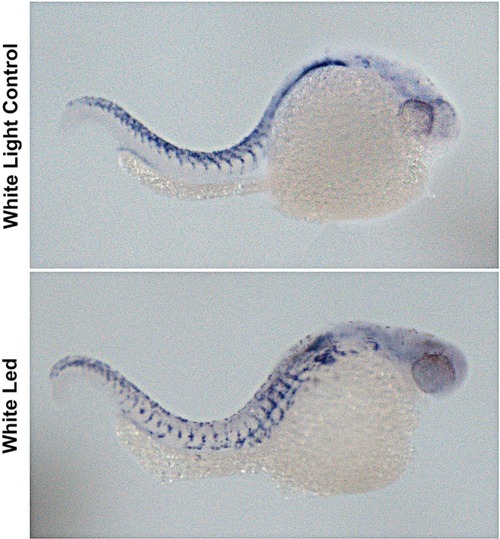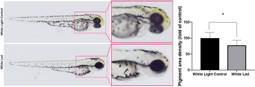 Effects of White LED light pigmentation in zebrafish embryos. (A) Synchronized embryos (n = 20) were exposed to White LED light and White light control. The effects on zebrafish pigmentation were observed under a stereomicroscope at 3 dpf. The pigmentation area density in the treated embryos was normalized to that of the control embryos using the ImageJ software. *p < 0.05, compared to the control. PHENOTYPE: