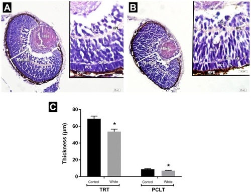 (A,B) Representative photomicrographs of the eyes of zebrafish embryos in the white light control and white LED light exposed groups at 72 hpf. White light control group. (A) Retina with regular layers. White LED light group. (B) disorganization of photoreceptor cells including spaces among cells. (C) Assesment of measurement of the thickness of total retina and photoreceptor cell layer. INL: Inner nuclear layer; GCL: Ganglion cell layer; PCL: Photoreceptor cell layer; IPL: Inner plexiform layer; OPL: Outer plexiform layer; TRT: Total retinal thickness; PCLT: Photoreceptor cell layer thickness; HE staining. PHENOTYPE: