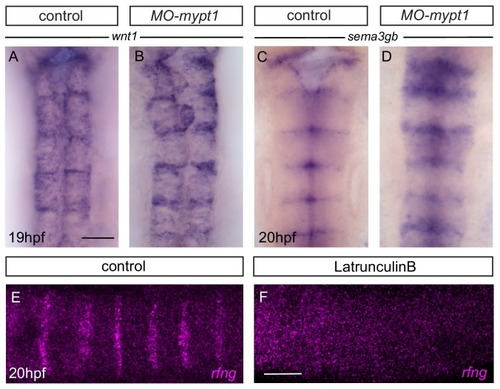 Actomyosin tension regulates boundary expression of rfng. (A, B) Immunostainings to detect actin (A) and pMLC (B) which co-localize at segment boundaries. (C, D) pMLC is detected at all boundaries in control embryos (C, 37/38) but not at r2/r3, r3/4 and r5/r6 boundaries in epha4-/- embryos (D, 24/24). Lateral views, anterior to the left. (E–G) rfng expression is increased in mypt1 knockdowns (F; 38/45) and embryos injected with CRISPR/Cas9 against mypt1 (G; 19/26), compared to controls (E; 37/38). (H) Depiction of Mypt1 regulating actomyosin tension by dephosphorylating pMLC. (I–L) HCR stainings reveal that rfng expression in epha4-expressing cells in control embryos (I, J; 24/24) is increased after knockdown of mypt1 (K, L; 28/36). (M–P) Myosin II inhibitor blebbistatin suppresses rfng transcription when treatment is initiated at 15 hpf (M; 21/21), 16 hpf (N; 25/25) or 17 hpf (O; 23/23), but it is less affected when initiated at 18 hpf (P; reduced in 8/22). (E–P) Dorsal views, anterior to the top. Scale bar: 50 μm. EXPRESSION / LABELING: