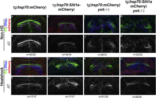 slit1a over-expression affects POC formation in wild type and homozygous yot embryos. A,B) Non-heatshock control of hsp70:mcherry embryo. A) Color composite MIP of frontal zebrafish forebrain showing POC and glial bridge, with cherry (red), Gfap (blue), AT (green), showing no red expression, and coincidence of the glial bridge (blue) with the POC (green). B) Single channel MIP of AT showing normal commissure formation. C,D) Heatshock control of hsp70:mcherry embryo. C) Color composite MIP of frontal zebrafish forebrain showing POC and glial bridge, with cherry (red), Gfap (blue), AT (green), showing red expression, and coincidence of the glial bridge (blue) with the POC (green). D) Single channel MIP of AT showing normal commissure formation. E,F) Non-heatshock control of hsp70:slit1a-mcherry embryo. E) Color composite MIP of frontal zebrafish forebrain showing POC and glial bridge, with cherry (red), Gfap (blue), AT (green), showing no red expression, and coincidence of the glial bridge (blue) with the POC (green). F) Single channel MIP of AT showing normal commissure formation. G,H) Heatshock hsp70:slit1a-mcherry embryo. G) Color composite MIP of frontal zebrafish forebrain showing POC and glial bridge, with cherry (red), Gfap (blue), AT (green), showing red expression, and disturbed glial bridge (blue) with a defasciculated POC (green). H) Single channel MIP of AT showing aberrant and defasciculated commissure formation. I,J) Non-heatshock control of you-too homozygous hsp70:mcherry embryo. I) Color composite MIP of frontal zebrafish forebrain showing POC and glial bridge, with cherry (red), Gfap (blue), AT (green), showing no red expression, and disturbed glial bridge formation (blue) and loss of commissure formation (green). J) Single channel MIP of AT showing loss of commissure formation. K,L) Heatshock control of you-too homozygous hsp70:mcherry embryo. J) Color composite MIP of frontal zebrafish forebrain showing POC and glial bridge, with cherry (red), Gfap (blue), AT (green), showing red expression, and disturbed glial bridge formation (blue) and loss of commissure formation (green). L) Single channel MIP of AT showing loss of commissure formation. M,N) Non-heatshock control of you-too homozygous hsp70:slit1a-mcherry embryo. M) Color composite MIP of frontal zebrafish forebrain showing POC and glial bridge, with cherry (red), Gfap (blue), AT (green), showing no red expression, and disturbed glial bridge formation (blue) and loss of commissure formation (green). N) Single channel MIP of AT showing loss of commissure formation. O,P) Heatshock you-too homozygous hsp70:slit1a-mcherry embryo. O) Color composite MIP of frontal zebrafish forebrain showing POC and glial bridge, with cherry (red), Gfap (blue), AT (green), showing red expression, and disturbed glial bridge formation (blue) and some commissure formation (green). P) Single channel MIP of AT showing partial commissure formation. |