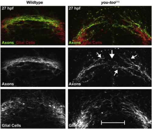 The you-too mutant POC exhibits a loss of commissure formation. The you-too mutant (gli2-DR) experiences a loss of commissure formation (AT) (Green) as compared to WT and disruption to the glial bridge (Gfap) (Red). |
