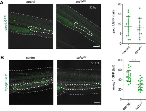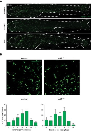 Two morphologically distinct populations of mpeg1+ cells in emerge from 15 dpf in the zebrafish skin.(A) Representative images of a control and csf1rDM zebrafish at 20 dpf. Dotted line represents the outline of the fish and its eye. (B) Quantification of the total number of mpeg1+ cells at one unilateral side of the fish at different time points between 8 and 24 dpf. The number of mpeg1+ cells was manually counted from the unilateral side presented in panel A. Plot showing the relationship between number of mpeg1+ cells and fish size. Each dot represents one fish. (C) Representative images of mpeg1+ cells in different body regions at 22 dpf showing differences in morphology between controls and csf1rDM or il34-/-mpeg1+ cells (n = 3 per group). Error bars represent standard deviation. Mpeg1+ cells were quantified on one side of the embryo (right side). |