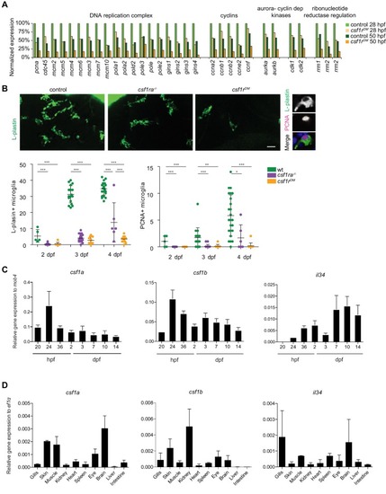 mpeg1+ primitive macrophages on the yolk in control and csf1rDM larvae.(A) Representative images of mpeg1+ macrophages located on the yolk (29 hpf) and quantification of mpeg1+ cell numbers over time. (B) Representative images of mpeg1+ positive primitive macrophages at 52 hpf. The dotted line indicates the border between the yolk (I) and the embryonic tissue (II). Quantification of mpeg1+ macrophages that colonized the tissue (II) and primitive macrophages located on the yolk (I). (C) Representative maximum projection of long term time lapse imaging of control and csf1rDM larvae showing migratory trajectories of mpeg1+ macrophages. (D) Snap shots from dividing mpeg1+ primitive macrophages in control and csf1rDM larvae (~36 hpf) and quantification of proliferative primitive macrophages during 16 hr time lapse imaging (~32 hpf – 48 hpf) (control n = 5, csf1rDM n = 3). (E) Quantification of fraction proliferative embryonic macrophages during 16 hr time lapse imaging (~56 hpf – 72 hpf) in control and csf1rDM larvae (n = 3 per group). Scale bars represent 100 µM. Error bars represent standard deviation. Statistical significance is calculated using one-way ANOVA with Dunnett’s multiple comparison test or Student’s t-tests *<0.05 **<0.01 ***<0.001. mpeg1+ cells were quantified on one side of the embryo (right side). Each dot represents one fish. |