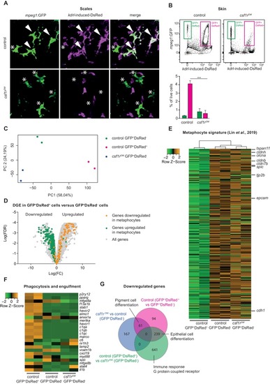 Amoeboid mpeg1+ cells in the zebrafish skin are of non-hematopoietic origin and have a metaphocyte transcriptome.(A) Immunofluorescence on manually dissected scales from adult skin of control and csf1rDMmpeg1:EGFP +; kdrl-induced-DsRed+ adults (4 mpf). Stars: single-positive (SP) cells; white arrowheads: double-positive (DP) cells. (B) FACS analysis on cells from the adult skin (4 mpf, n = 3 per group) and quantification. GFP+DsRed-=mpeg1+ only, GFP+DsRed+=mpeg1+/kdrl-induced-DsRed+. (C) PCA analysis showing segregatin based on cell type (PC1) and genotype (PC2). (D) Volcano plot showing gene expression changes between control GFP+DsRed+ versus GFP+DsRed- cells. Light grey: DGE of all genes, Green: DGE of genes enriched in metaphocytes logFC >2 (Lin et al., 2019); Orange: DGE of genes downregulated in metaphocytes logFC <2 (Lin et al., 2019). (E) Heat map showing the expression of metaphocyte signature genes. (F) Heat map showing the expression of phagocytosis and engulfment genes. (G) Venn diagram showing DGE between the three groups (logFC > |2|; FDR < 0.05). |
