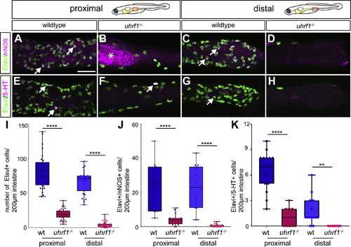 Both of the major ENS neuronal subtypes are reduced in uhrf1 mutants. Confocal images of dissected intestines from wildtypes (A,C,E,G) and uhrf1 mutants (B,D,F,H) stained for expression of the pan-neuronal marker Elavl, and either nNOS or 5-HT. In both proximal (B,F) and distal (D,H) intestine, uhrf1 mutants have fewer enteric neurons than wildtype siblings at 5 dpf (proximal A,E; distal C,G) as quantified in (I). Both nNOS and 5-HT expressing ENS neuronal subtypes show similar reductions at 5 dpf [Elavl (green), nNOS or 5-HT (magenta)] as quantified in (J,K). Arrows point to examples of nNOS or 5-HT positive neurons. (I) Quantification of Elavl positive cells per 200 μm of proximal or distal intestine in wildtype (blue) or mutant (red) [wildtype n = 30 (proximal), n = 29 (distal); uhrf1−/− n = 29 (proximal), n = 30 (distal)]. (J–K) Quantification of Elavl and nNOS (J) and 5-HT (K) positive cells per 200 μm proximal or distal intestine in wildtype (blue) and mutant (red) [nNOS: wildtype n = 11 (proximal), n = 15 (distal); uhrf1−/− n = 17 (proximal), n = 17 (distal); 5-HT: wildtype n = 17 (proximal), n = 14 (distal); uhrf1−/− n = 15 (proximal), n = 13 (distal)]. Asterisk in B indicates autofluorescent background common to uhrf1 mutant intestines. Scale bar = 50 μm in A-H. Unpaired t-test: **** = p < 0.0001; ** = p < 0.01. |