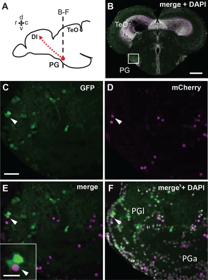 Co-localization of GFP and mCherry in the adult PG cells of the quadruple transgenic line Tg(her5:ERT2CreERT2;βactin:lox-stop-lox-hmgb1-mCherry;279A-GFP) following the tamoxifen induction at 24 hpf.(A) Schematic drawing of the adult zebrafish brain indicating the level of section through the PG shown in B-F. (B) A single plane confocal image showing a global view of the frontal section of a 3 mpf zebrafish brain. The white square indicates the PGl shown in C-F at a higher magnification. (C–F) A confocal image (5 µm projection) showing the co-localization of GFP and mCherry in PGl (arrowheads). Inset of E shows the double-labeled cell at a higher magnification. Abbreviations: Dl, lateral part of dorsal telencephalic area; PG, preglomerular complex; PGa, anterior preglomerular nucleus; PGl, lateral preglomerular nucleus; TeO, optic tectum. Brain orientation: r, rostral; c, caudal; d, dorsal; v, ventral. Scale bars = 200 µm (B); 30 µm (C; applicable to D-F); 10 µm (inset of E). |