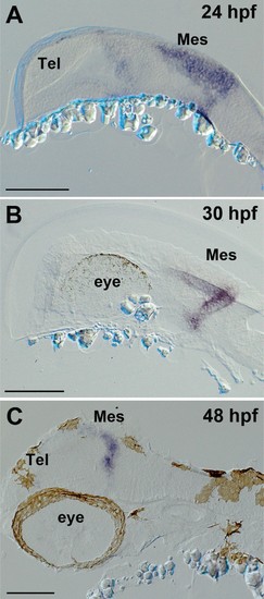 Expression of ert2Cre in the Tg(Dr830:ERT2CreERT2) embryonic brains.(A–C) Sagittal sections of embryonic brains (rostral to the left). At 24 hpf (A), ert2Cre is highly expressed in the mesencephalic domain, and a weak expression is also found in the anterior part of the brain. Later, at 30 hpf (B), the ertCre expression becomes limited to the mesencephalon. At 48 hpf (C), the ertCre expression is found exclusively in the tectal area. In C, the section plane is slightly tilted showing a more dorsal view of the embryo. Abbreviations: Mes, mesencephalic area; Tel, telencephalic area. Scale bars = 100 µm. |