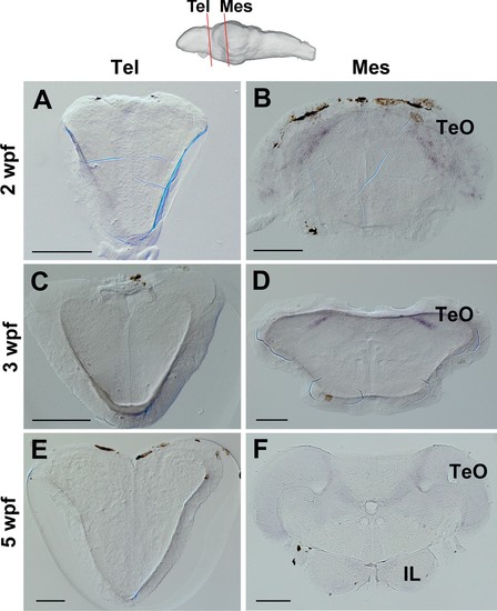 Expression of ert2Cre in the Tg(Dr830:ERT2CreERT2) juvenile brains.(A–F) Frontal sections of juvenile brains showing the telencephalic (Tel) and mesencephalic (Mes) areas. The levels of the frontal sections are indicated on the schematic drawing of a lateral view of the brain. In the 2 wpf (A and B), 3 wpf (C and D), and 5 wpf (E and F) juvenile brains, ert2Cre is expressed exclusively in the tectal area (B, D, and F). Abbreviations: IL, inferior lobe; Mes, mesencephalic area; Tel, telencephalic area; TeO, optic tectum. Scale bars = 100 µm (A–E); 200 µm (F). |