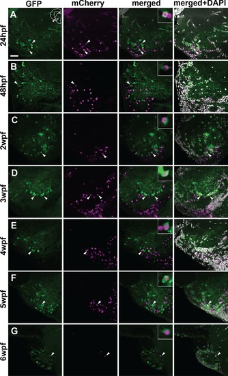 Co-localization of GFP and mCherry in the adult PG cells of the quadruple transgenic line Tg(Dr830:ERT2CreERT2;βactin:lox-stop-lox-hmgb1-mCherry;279A-GFP) following the tamoxifen induction at different developmental stages.(A–G) Confocal images (5 µm projection) of frontal sections through the PG showing the co-localization of GFP and mCherry (arrowheads). The GFP/mCherry co-localization was consistently observed in the animals induced up to 6 wpf. Co-labelled cells are shown at a higher magnification in the insets in merged images. The section plane shown here is identical to that in Figure 6. Scale bar = 30 µm. |