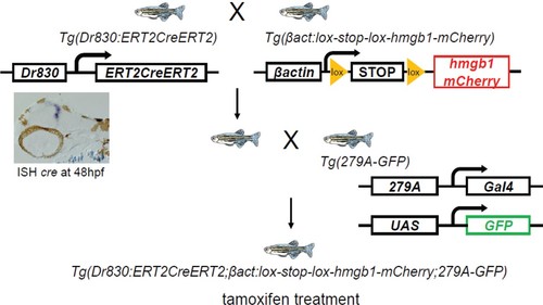 A simplified schema of the constructs of transgenic lines and order of crossing to generate the second quadruple transgenic fish: Tg(Dr830:ERT2CreERT2;βactin:lox-stop-lox-hmgb1-mCherry;279A-GFP). |