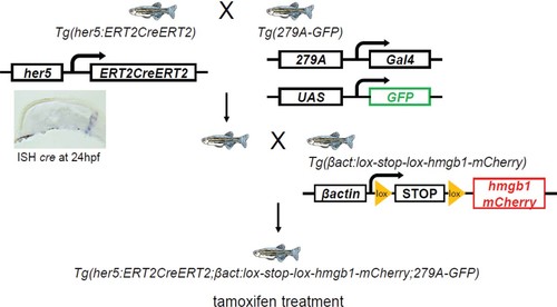 A simplified schema of the constructs of transgenic lines and order of crossing to generate the first quadruple transgenic fish: Tg(her5:ERT2CreERT2;βactin:lox-stop-lox-hmgb1-mCherry;279A-GFP). |