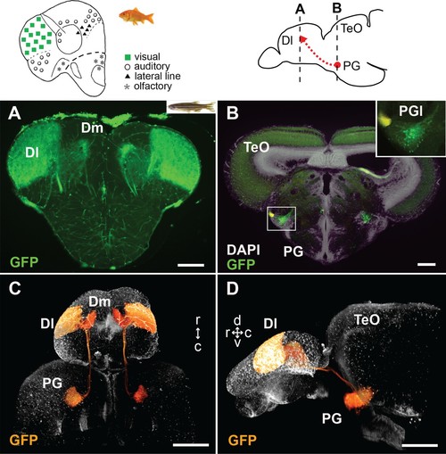 GFP+ afferents in Tg(279A-GFP) zebrafish transgenic line.(A and B) Frontal sections of Tg(279A-GFP) adult brain showing the GFP+ fibers in Dl of the pallium (A), and GFP+ cell bodies in PG (more specifically, PGl; B). The levels of the frontal sections are indicated on the schematic drawing of a lateral view of the brain (upper right). (A) Abundant GFP+ fibers are found in the zebrafish Dl, which corresponds to the main visual area in the goldfish pallium (upper left schematic drawing adapted from Yamamoto, 2009). (B) A brain section at the level of PG. Higher magnification of the right side of PG is shown in the inset. Based on the nomenclature from goldfish, we define the GFP+ PG cell cluster projecting to the Dl as PGl in the present study. (C and D) Selected visualization of the GFP+ projections from PGl to the pallium. After 3D reconstruction of the whole brain imaging of Tg(279A-GFP), the GFP+ signal of the PGl cells was selectively visualized in order to follow their projections (see Materials and methods). C shows the dorsal view of the brain and D shows the lateral view. The original movie is shown in Video 1. Abbreviations: Dl, lateral part of dorsal telencephalic area; Dm, medial part of dorsal telencephalic area; PG, preglomerular complex; PGl, lateral preglomerular nucleus; TeO, optic tectum. Brain orientation: r, rostral; c, caudal; d, dorsal; v, ventral. Scale bars = 100 µm (A and B); 500 µm (C and D). |