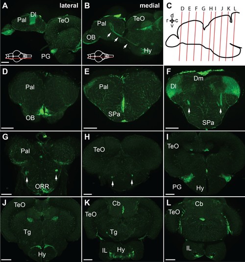 GFP expression of the Tg(279A-GFP) adult brain.(A and B) Sagittal sections of the Tg(279A-GFP) adult brain (anterior to the left). A is a more lateral section showing the PG and Dl, and B is a more medial section showing the PG axons coursing to the Dl (arrows). (C) Schematic drawing of a sagittal section indicating the level of the frontal sections shown in (D–L). (D–L) Frontal sections of the Tg(279A-GFP) adult brain from anterior to posterior. The PG-pallial projection fibers are indicated with arrows in (F), (G), and (H). Note that the GFP expression is not exclusive to the PG-pallial projection neurons, but some other structures such as the olfactory bulb (OB) and the hypothalamus (Hy) are also labeled. Abbreviations: Cb, cerebellum; Dl, lateral part of dorsal telencephalic area; Dm, medial part of dorsal telencephalic area; IL, inferior lobe; Hy, hypothalamus; OB, olfactory bulb; ORR, optic recess region; Pal, pallium; PG, preglomerular complex; SPa, subpallium; TeO, optic tectum; Tg, tegmentum. Brain orientation: r, rostral; c, caudal; d, dorsal; v, ventral. Scale bars,=200 µm. |
