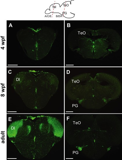 Progression of GFP expression in the Tg(279A-GFP) brain during development.Frontal sections of 4 wpf (A and B), 8 wpf (C and D), and the adult (E and F) brains at the level of the telencephalon (A, C, and E) and PG (B, D, and F). Approximate antero-posterior levels are indicated in the schematic drawing on the top. At 4 wpf, there is no GFP+ fiber in the Dl (A) nor GFP+ cell around the PG (B). The GFP+ cells (presumably in the PGl) become obvious at 8 wpf (D), but their fiber labeling in the Dl is significantly weaker (C) in comparison to the adult (E). Abbreviations: Dl, lateral part of dorsal telencephalic area; PG, preglomerular complex; TeO, optic tectum. Scale bar = 200 µm. |