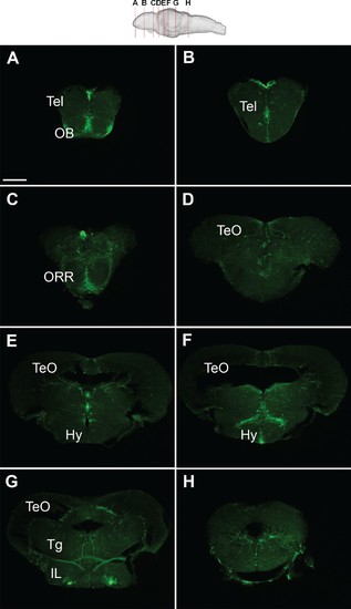 GFP expression of the Tg(279A-GFP) brain at 4 wpf.Frontal sections of the juvenile brain from anterior to posterior. Approximate levels of frontal sections are indicated in the schematic drawing on the top. The PGl-Dl projection is not observable at this stage. Abbreviations: IL, inferior lobe; Hy, hypothalamus; OB, olfactory bulb; ORR, optic recess region; Tel, telencephalon; TeO, optic tectum; Tg, tegmentum. Scale bar = 200 µm. |