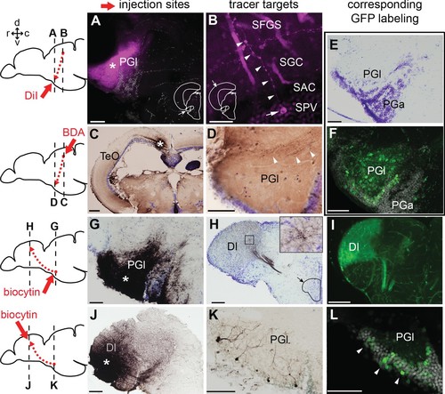 Tract-tracing study showing connections of the lateral preglomerular nucleus (PGl).Schematic drawings indicate the injection site of each tracer and levels of the frontal sections shown on the right panels. In all the frontal sections shown in A-L, the lateral side of the brain is to the left. (A–F) PGl receiving tectal inputs. (A and B) DiI retrograde labeling (magenta), showing the injection site in the PGl (A; asterisk), and a retrogradely labeled neuron (B; arrow) located in a deep layer (SPV) of the optic tectum (TeO). This neuron extends its dendrites (B; arrowheads) to the upper layer (SFGS) where retinal projections terminate. (C and D) BDA anterograde labeling (brown) showing the injection site in TeO (C; asterisk) and anterogradely labeled terminals in the ipsilateral PGl (D; arrowheads). (E) Cresyl violet staining showing the cytoarchitecture of the zebrafish PG: the lateral (PGl) and the anterior (PGa) subdivisions can be identified, based on the comparison with the goldfish PG (the nomenclature applied from goldfish; Yamamoto and Ito, 2008). (F) GFP+ labeling in the PG of Tg(279A-GFP) zebrafish line (20 µm projection of confocal images; GFP in green and DAPI in grey), showing a section comparable to the level shown in (E). GFP+ perikarya are mostly found in PGl. (G–L) PGl neurons projecting to Dl of the pallium. (G and H) Biocytin injection site in the PGl (G; asterisk) and anterogradely labeled terminals in the ipsilateral Dl (H). The right top inset in (H) shows a higher magnification of the squared area showing numerous labeled terminals. (I) GFP+ fiber labeling in the Dl of Tg(279A-GFP) zebrafish line, demonstrating an arborization pattern comparable to the anterograde biocytin labeling shown in (H). (J and K) Biocytin injection site in the Dl (J; asterisk), and retrogradely labeled neurons in the ipsilateral PGl (K) that extend dendrites ramifying in the neuropil. (L) GFP+ perikarya labeling in the PGl of Tg(279A-GFP) zebrafish line (arrowheads; 5 µm projection), demonstrating the almost identical cell localization as shown in (K). Abbreviations: Dl, lateral part of dorsal telencephalic area; PGa, anterior preglomerular nucleus; PGl, lateral preglomerular nucleus; SAC, stratum album centrale; SFGS, stratum fibrosum et griseum superficiale; SGC, stratum griseum centrale; SPV, stratum periventriculare; TeO, optic tectum. Brain orientation: r, rostral; c, caudal; d, dorsal; v, ventral. Scale bars = 50 µm (A, D-G, K, and L); 20 µm (B); 200 µm (C); 100 µm (H–J). |