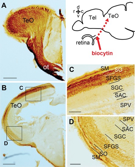 Retinal projections terminating in TeO.(A–D) Frontal sections of the adult TeO (lateral to the left) visualizing biocytin-labeled structures subsequent injection in the optic nerve. (A) The most anterior part of TeO shown with intensively labeled optic tract (ot). (B) More posterior TeO showing the biocytin-labeled nerve terminals in the upper layer of TeO. C and D show a higher magnification of the squared areas in (B), showing the layered cytoarchitecture of the TeO. Abbreviations: ot, optic tract; SAC, stratum album centrale; SFGS, stratum fibrosum et griseum superficiale; SGC, stratum griseum centrale; SM, stratum marginale; SO, stratum opticum; SPV, stratum periventriculare; Tel, telencephalon; TeO, optic tectum. Brain orientation: r, rostral; c, caudal; d, dorsal; v, ventral. Scale bars = 200 µm (A and B); 50 µm (C and D). |