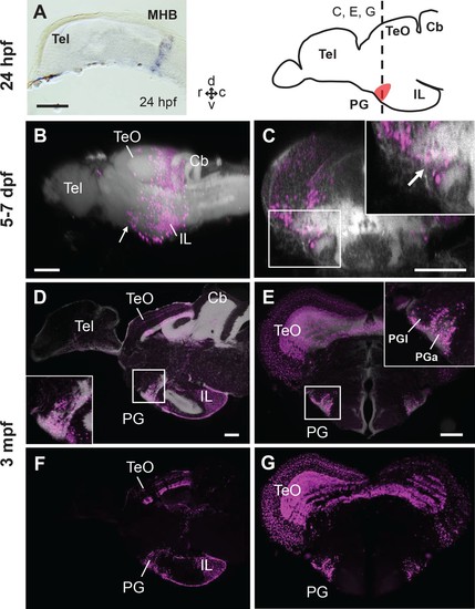 Progression of the mCherry+ cell distribution in the PG of Tg(her5:ERT2CreERT2;βactin:lox-stop-lox-hmgb1-mCherry) zebrafish treated with tamoxifen at 24hpf.(A) In situ hybridization (ISH) of ert2Cre showing that the expression of Cre in this line is limited to the midbrain-hindbrain boundary (MHB) at 24 hpf. (B–G) Sagittal (B, D, F) and frontal (C, E, G) views of brains showing the development of PG region. The schematic drawing of the zebrafish brain shows the position of PG (indicating the level of the frontal sections shown in C, E, and G). Higher magnifications of the PG region are shown in the insets. mCherry+ cells are shown in magenta, and brain morphology (DiD fiber labeling in B and C, DAPI in D and E) is shown in grey. (B and C) 3D reconstruction from confocal images of 5–7 dpf larval brains (images reused from Bloch et al., 2019). The arrows indicate the PG primordium. (D–G) Adult brain sections, with (D and E) and without DAPI (F and G). Abbreviations: Cb, cerebellum; IL, inferior lobe; MHB, midbrain-hindbrain boundary; PG, preglomerular complex; PGa, anterior preglomerular nucleus; PGl, lateral preglomerular nucleus; Tel, telencephalon; TeO, optic tectum. Brain orientation: r, rostral; c, caudal; d, dorsal; v, ventral. Scale bars = 100 µm. |