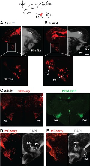 Distribution of mCherry+ cells in the PG following tamoxifen induction at 24 hpf in Tg(her5:ERT2CreERT2;βactin:lox-stop-lox-hmgb1-mCherry).A and B show frontal sections of juvenile brains, and C–E show of adult brains. The level of the frontal sections is indicated in the schematic drawing on the top. (A and B) mCherry+ cells at the level of PG at two different juvenile stages. The left half of the frontal section shows the distribution of mCherry (red), whereas the right half shows DAPI staining (grey) to illustrate the cytoarchitecture of the brain. At 19 dpf (A), the nucleus is labeled as ‘PG/TLa’, because they develop as a continuous structure and not easy to distinguish until around 5 wpf (B). (C) Adult brain sections at the level of PGl comparing the mCherry expression in Tg(her5:ERT2CreERT2;βactin:lox-stop-lox-hmgb1-mCherry) and GFP expression in Tg(279A-GFP). Abundant mCherry+ cells are found in the adult PGl, overlapping the location of GFP+ pallial projection neurons. (D and E) Adult brain sections showing more caudal levels than (C). The left half of the frontal section shows the distribution of mCherry (red), whereas the right half shows DAPI staining (grey) to illustrate the cytoarchitecture of the brain. E shows more caudal than D. The mCherry labelings are found throughout the PG, including the caudal PGl and PGm. Abbreviations: Cb, cerebellum; IL, inferior lobe; PG, preglomerular complex; PGl, lateral preglomerular nucleus; PGm, medial preglomerular nucleus; Tel, telencephalon, TeO, optic tectum; TLa, torus lateralis. Brain orientation: r, rostral; c, caudal; d, dorsal; v, ventral. Scale bars = 50 µm (B), 200 µm (C). |