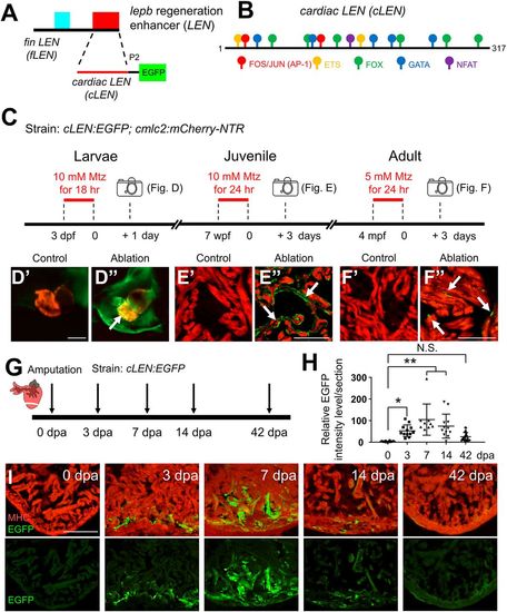 Regeneration-dependent activity of cardiac LEN (cLEN). (A) Schematic of lepb regeneration enhancer (LEN) containing two tissue-specific regeneration modules. A transgene construct examined for cLEN activity consists of 317 bp of cLEN, lepb 2 kb upstream promoter (P2) and EGFP reporter sequences. (B) Schematic of cLEN annotated with predicted TF binding sites. (C-F) Zebrafish strain and experimental strategy undertaken to ablate CMs (C) and images of uninjured and ablated hearts in larvae (D), juveniles (E) and adults (F). (G-I) Dynamic cLEN activity during zebrafish heart regeneration. (G) Experimental design to determine cLEN activity during heart regeneration. (H) Quantification of EGFP expression intensity normalized to images of wild-type uninjured hearts at the wound area. The data are presented as the mean±s.d. Numbers of animals are shown in Table S3. *P<0.05; **P<0.01; N.S., not significant. One-way ANOVA with Tukey's post-hoc test. (I) Images of cardiac sections of uninjured and regenerating hearts. Scale bars: 100 µm in E″,F″,I; 50 µm in D′. |