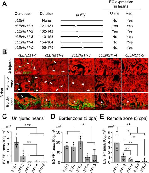 Molecular dissection of cLEN to identify the fragment containing injury-responsive elements. (A) Transgene constructs examined for regeneration-dependent expression in response to cardiac injury. Endocardial expression results are summarized on the right. EC, endocardial cell. Uninj. and Reg. correspond to uninjured and 3 dpa regenerating hearts, respectively. (B) Images of sections of 3 dpa hearts from transgenic fish carrying cLEN fragments. Numbers of animals are shown in Table S3. The arrows indicate endocardial EGFP induction. Note that the P2 promoter directs basal expression in CMs in response to injury (see Fig. S3; Kang et al., 2016). MHC, myosin heavy chain, a CM marker. (C) Transgenic constructs used to examine enhancer activity in the F0 mosaic injured hearts. Two AP-1 binding sites were mutated in cLENAP-1m (black circles). AFNEGx3 is a synthetic cardiac regeneration enhancer consisting of three tandem copies of the AP-1-FOX-NFAT-ETS-GATA motifs. (D) Schematic of enhancer assays in the F0 mosaic hearts. (E) Images of injured hearts of larvae injected with P2, cLEN, cLENAP-1m and AFNEGx3. Note that larvae carrying transgenic constructs were selected by mCherry expression in the lens, without a cardiac EGFP signal. The arrows indicate injury-responsive EGFP induction in the injured hearts. Numbers at the bottom corners indicate the total ratio of embryos showing the corresponding expression pattern. Scale bars: 100 µm in B; 50 µm in E. |