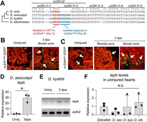 The cLEN repressive element, but not a neighboring sequence, is present in other Danio species. (A) Alignment of orthologous sequences of cLEN11-1 to cLEN11-5 in Danio species, including Danio rerio, Danio aesculapii, Danio kyathit and Danio albolineatus. cLEN-22 contains 6 or 9 bp insertions in non-zebrafish sequences. Asterisks indicate conserved base pairs. The conserved GTCA sequence overlapping cLEN-11-1 and cLEN-11-2 is marked in red. Dendrogram indicates phylogenetic relationship. (B) Images of cardiac sections of cLENins6bp:EGFP transgenic fish harboring a 6 bp insertion (TGTGTA). (C) Images of cardiac sections of cLENmgtca:EGFP transgenic fish harboring the mutation of GTCA to CATT. The arrows indicate endocardial EGFP expression. Numbers of animals are shown in Table S3. (D) RT-qPCR analysis of lepb in uninjured and 3 dpa hearts of D. aesculapii. (E) RT-PCR of samples from the uninjured and 3 dpa hearts of D. kyathit. actb2 was used as the loading control. Uninj., uninjured hearts. (F) RT-qPCR analysis of lepb in the uninjured hearts of zebrafish, D. aesculapii, D. kyathit and D. albolineatus. The data are presented as mean±s.d., n=3; lepb transcript levels were normalized to actb2 levels in D,F. *P<0.05; N.S., not significant. Student's unpaired, two-tailed t-test. Scale bars: 100 µm in B,C. |