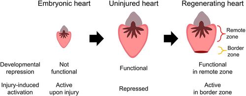 Proposed model of regulation of the activity of cardiac TREEs in uninjured and regenerating hearts. In uninjured embryonic hearts, cardiac TREEs are inactive; they are activated upon injury. Repression of cardiac TREEs is not functional in the heart in early development. During maturation, cardiac TREEs are actively repressed to prevent aberrant activation in uninjured tissues. Upon injury, the dual function of distinct cis-regulatory elements restricts cardiac TREE activation to the wounded area. |