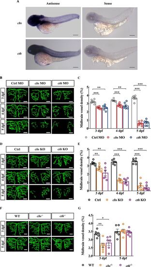 Knockdown and knockout of cbs or cth impair brain vascular development of larval zebrafish. (A) In situ hybridisation of whole zebrafish larvae at 3 dpf showing the ubiquitous expression of cbs and cth in the brain (lateral view). (B and C) Effects of morpholino oligonucleotide-mediated cbs or cth knockdown on brain vascular development. (B) Representative midbrain vessel structures reconstructed from confocal images of cbs or cth morphants at 3–5 dpf of the same larva. (C) Summary of data. The experiments were repeated three times, and six embryos were examined for each group at each time. (D and E) Effects of cbs or cth knockout (F0) on brain vascular development. (D) Representative midbrain vessel structures reconstructed from confocal images of the same F0 mutant larva at 3–5 dpf. (E) Summary of data. Six embryos were examined for each group. (F and G) Effects of cbs or cth homomutants on brain vascular development. (F) Representative midbrain vessel structures reconstructed from confocal images of the same cbs or cth homomutant larva at 3 and 5 dpf. (G) Summary of data. Six embryos were examined for each group. Scale bar, 300 µm (A), 25 µm (B, D, F). Error bars, SEM. *P<0.05, **p<0.01, ***p<0.001 (unpaired two-tailed Student’s t-test). |