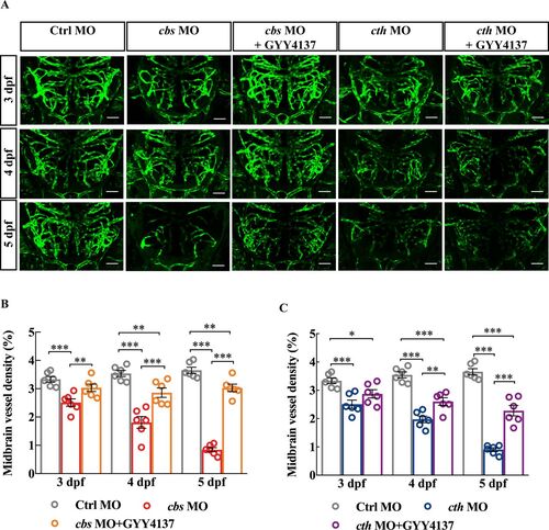 Rescue effect of GYY4137 on the defects of brain vascular development in cbs and cth morphants. (A) Representative projected confocal images showing that GYY4137 treatment ameliorated the impaired brain vascular development in cbs and cth morphants. Confocal images were taken at 3–5 dpf of the same larva. (B) Summary of the rescue effect of GYY4137. Six embryos were examined for each group. Scale bar, 50 µm (A). Error bars, SEM. *P<0.05, **p<0.01, ***p<0.001 (one-way analysis of variance). MO, morpholino oligonucleotide. |