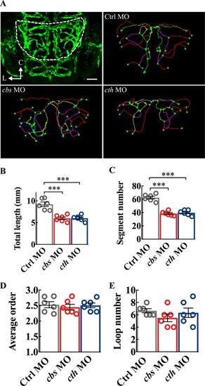 Structure analysis of the midbrain vasculature in cbs and cth morphants. (A) Image of a 3-dpf larva showing the midbrain position delineated with dashed lines (upper left), and representative midbrain vasculature centerlines of 3-dpf larvae of Ctrl morpholino oligonucleotide (MO; upper right), cbs MO (lower left), and cth MO (lower right). C, caudal; L, lateral. (B–E) Summary of changes in the total vessel length (B), vessel segment number (C), weighted average segment Strahler order (D) and internal vessel loop number (E) of the midbrain vasculature in groups of Ctrl MO, cbs MO and cth MO. Six embryos were examined for each group. Error bars, SEM. ***P<0.001 (unpaired two-tailed Student’s t-test). |