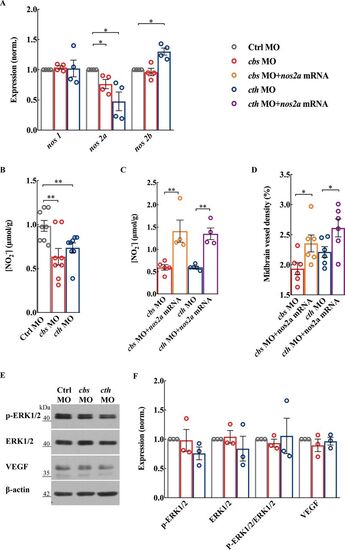 The nitric oxide synthase (NOS)/nitric oxide (NO) pathway is involved in cbs and cth knockdown-induced defects of brain vascular development. (A and B) Effects of cbs and cth knockdown on the NOS/NO signalling pathway. Summary of nos1, nos2a and nos2b RNA expression (A) and total NO production (B) in 3-days post fertilisation (dpf) embryos. (C and D) Rescue effect of nos2a mRNA on the brain vascular developmental defects in cbs and cth morphants. Summary of increased total NO production (C) and midbrain vessel density (D) in 3-dpf embryos coinjected with cbs or cth MO and nos2a mRNA in comparison with those injected with cbs or cth MO. Six embryos were examined for each group. (E and F) No effect of cbs and cth knockdown on the protein expression of p-ERK1/2, ERK1/2 and VEGF. Representative blots (E) and summary (F) of Western blotting data. Error bars, SEM. *P<0.05, **p<0.01 (unpaired two-tailed Student’s t-test). |