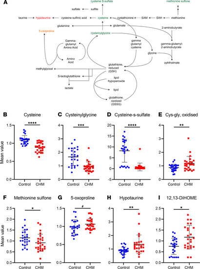 CHM patients exhibit evidence of increased oxidative stress. (A) Schematic of the glutathione metabolism pathway, where several compounds were found to be increased (red) or decreased (green) in CHM patients compared with controls. Metabolites trending to significance (0.05 < P ≤ 0.1) are represented in a lighter shade to distinguish from those significantly altered (P ≤ 0.05). (B–I) Scatter dot plots of specific metabolites indicating the mean ± SD levels in CHM patient samples (red) and control samples (blue) (n = 25). P value was determined using matched pair t tests. #0.05 < P ≤ 0.1, *P ≤ 0.05, **P ≤ 0.01, ***P ≤ 0.001, ****P ≤ 0.0001. |