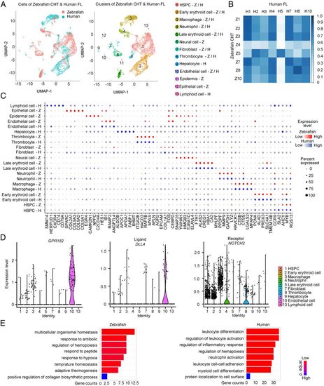Cross-species analysis between human FL and zebrafish CHT reveals conserved and divergent gene-expression profiles. (A, Left) Unsupervised graph-based clustering of single cells from human FL (n = 8,432) and zebrafish CHT (n = 10,010) based on homologous gene-expression profiles; color labels for different species. (A, Right) Color labels for identified cell clusters. (B) Similarity matrix showing the Pearson correlations between each pair of corresponding cell clusters from human FL and zebrafish CHT based on homologous gene-expression profiles. (C) Dot plot showing the conserved signature genes of each cluster in human and zebrafish. (D) Identification of GPR182, DLL4, and NOTCH2 expression in human FL cell clusters. (E) The major GO terms of divergent HSPC genes in human FL and zebrafish CHT. |