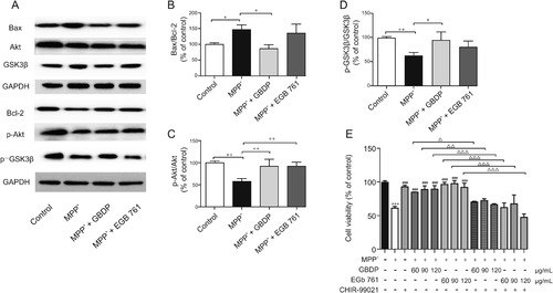 | GBDP treatment decreased the Bax/Bcl-2 ratio and increased Akt/GSK3β levels in MPP+-treated human SH-SY5Y cells. (A) Western blot assay of p-Akt, Akt, p-GSK3β, GSK3β, Bax, and Bcl-2. (B–D) Ratio of p-Akt, Akt, p-GSK3β, GSK3β, Bax, and Bcl-2 band intensities. ∗P < 0.05, ∗∗P < 0.001. (E) SH-SY5Y cells were pre-treated with the GSK3β inhibitor, CHIR-99021 (10 μM) for 2 h and subsequently exposed to 2 mM MPP+ and different concentrations of GBDP or EGb 761. After 24 h, cells underwent an MTT assay. ∗∗∗P < 0.0001, compared with the control group. ###P < 0.0001, compared with the MPP+ group. △P < 0.05, △△P < 0.001, △△△P < 0.0001. Data were analyzed by one-way ANOVA followed by Dunnett’s test. n = 3 per group. GAPDH: glyceraldehyde-3-phosphate dehydrogenase. |