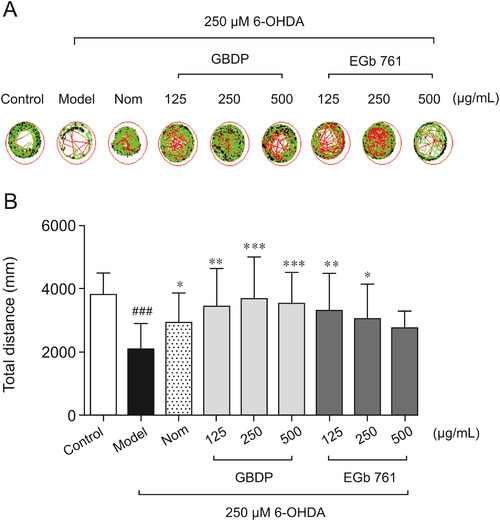 | GBDP rescued 6-hydroxy-dopamine (6-OHDA)-induced locomotor impairment in zebrafish. (A) A Viewpoint Zebrabox system was used to test locomotive behavior. The green plot and the red line represent the movement trajectories recorded by the Viewpoint Zebrabox system. (B) Total distance travelled in 30 min. Data were analyzed by one-way ANOVA followed by Dunnett’s test. ###P < 0.0001, compared with the control group; ∗P < 0.05, ∗∗P < 0.001, ∗∗∗P < 0.0001, compared with the 6-OHDA group. n = 10 per group. Nom indicates the positive control nomifensine-treated group. PHENOTYPE: