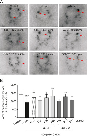 | GBDP protected against 6-OHDA-induced dopaminergic neuron loss in zebrafish. (A) Representative images of DA neurons in the zebrafish brain, indicated by tyrosine hydroxylase immunostaining. Red arrow: dopaminergic neurons in the zebrafish brain. (B) The area of the dopaminergic neurons calculated for each group. Data were analyzed by one-way ANOVA followed by Dunnett’s test. ###P < 0.0001, compared with the control group; ∗P < 0.05, ∗∗P < 0.001 compared with the 6-OHDA group. n = 10 per group. EXPRESSION / LABELING: