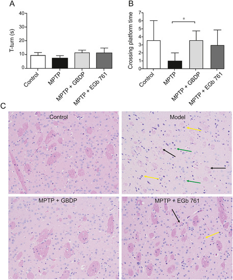 | GBDP improves 1-methyl-4-phenyl-1,2,3,6-tetrahydropyridine (MPTP)-induced cognitive impairment in mice. (A) T-turn time in the pole test on day 19. (B) Site crossings in the morris water maze (MWM) test. (C) GBDP protected dopaminergic neurons in the MPTP-induced mouse model of Parkinson’s disease. Brain sections were processed for HE staining. Black arrow: nerve fiber bundles are loose and lightly stained and the fiber components are significantly reduced; yellow arrow: a large number of neurons were atrophied and the nuclei were intensely stained; green arrow: glial cells show slight hyperplasia. ∗∗P < 0.001. Data were analyzed by unpaired, two-tailed Student’s t-test. n = 5 per group. |