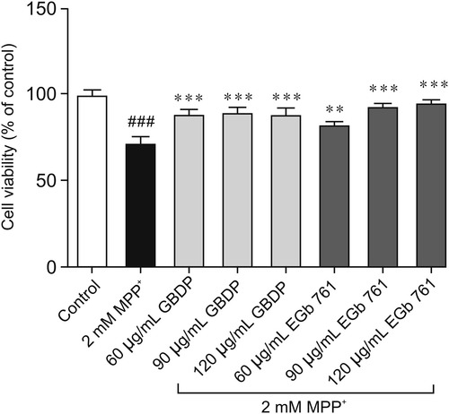 | GBDP protected SH-SY5Y cells against 1-methyl-4-phenyl-pyridinium (MPP+)-induced toxicity. GBDP and EGb 761 protected SH-SY5Y cells against the MPP+-induced decrease in cell viability. Data were analyzed by one-way ANOVA followed by Dunnett’s test. ###P < 0.0001, compared with the control group; ∗∗P < 0.001, ∗∗∗P < 0.0001, compared with the MPP+ group. n = 3 per group. |