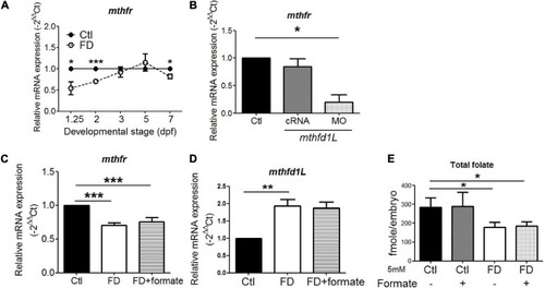 Larval folate composition and response to rescuing agents. Both control and FD embryos continuously exposed to rescuing agents starting from 25 hpf were examined for their intracellular folate composition PHENOTYPE: