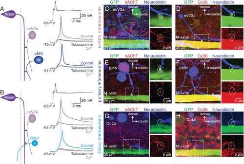 esV2a interneurons are recruited prior to pMNs and CoLo interneurons. (A) Triple whole-cell patch-clamp recording from an M-cell, an esV2a interneuron and a pMN. M-cell activation recruited first the esV2a interneuron and then the pMN. d-tubocurarine suppressed the firing of both neurons and only a Cd2+-insensitive eEPSP remained. (B) Triple whole-cell patch-clamp recording from an M-cell, an esV2a interneuron and a CoLo interneuron. The latter was recruited later than the esV2a interneuron. The cholinergic cEPSPs in both neurons were blocked by d-tubocurarine, leaving only an eEPSP remained that was unaffected by Cd2+. (C) Direct contact between the M-axon (green) and the axon of an esV2a interneuron (blue). VAChT (red) was expressed at the site of presumed synaptic contact (dashed box, Left). The large soma corresponds to a pMN expressing GFP in this line. (D) Expression of Cx36 (red) at the site of synaptic connections between the M-axon and esV2a interneuron (blue). (E) The expression of VAChT (red) was found at the presumed synaptic contact site between an M-axon (green) and a pMN (blue). (F) Cx36 (red) is expressed at the connection site between the M-axon and pMN. (G) The expression of VAChT (red) was found at the presumed synaptic contact site between an M-axon (green) and a CoLo interneuron (blue). (H) Expression of Cx36 (red) at the connection site between the M-axon and CoLo interneuron. The Right Upper and Lower panels in C–H represent magnification of the regions indicated by the dashed boxes in the Left panels. The white dotted circle indicates the synapses formed by the M-cell and spinal neurons. |