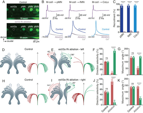 Ablation of spinal esV2a interneurons suppresses the transmission of the escape command and the behavioral laterality in vivo. (A) Two-photon microscope images of the spinal cord before (Upper) and after laser ablation (Lower) of an esV2a interneuron. (B) Ablation of esV2a interneurons eliminated the ability of the M-cell to elicit an action potential in a pMN, an fMN, and a CoLo interneuron. Only direct electrical transmission from the M-cell remained and was unaffected by Cd2+. (C) Quantification of the probability of recruitment of pMNs, fMNs, and CoLo interneurons before and after esV2a interneuron ablation. Graph shows mean ± SD, n = 7 each; Student’s t test, P = 1 × 10−7 for pMN, P = 8 × 10−6 for fMN, and P = 6 × 10−7 for CoLo. Each dot represents the data from single neurons. (D) In freely behaving zebrafish in vivo, the direction of escape behavior was flexible in response to a brief sound stimulation from a constant source location. Zebrafish produced escape behavior directed toward both directions. (E) In animals with ablation of esV2a interneurons on the left side of spinal cord, escape was almost exclusively directed toward the intact side of the spinal cord. The maximum body bending angle was shallower toward the ablated side. (F) Quantification of the directional selectivity of escape behavior before and after esV2a interneuron ablation. Data in the graph represent mean ± SD; Student’s t test, P > 0.5 for control; P = 4 × 10−5 for ablation, n = 8 for each group. (G) Maximum body bending angle in control and in ablated fish. Data in the graph represent mean ± SD; Student’s t test, P > 0.5 for control; P = 9 × 10−5 for ablation, n = 8 for each group. (H) Control zebrafish were able to escape in both direction in response to sound stimulation. (I) After ablation of esV2a interneurons on the right side of spinal cord, the direction of escape was confined toward the intact side of the spinal cord. (J) Quantification of the directionality of escape before and after esV2a interneuron ablation. Data in the graph represent mean ± SD; Student’s t test, P > 0.5 for control; P = 3 × 10−6 for ablation, n = 7 for each group. Each dot represents the data from single animals. (K) Maximum body bending angle in control and in ablated fish. Data in the graph represent mean ± SD; Student’s t test, P > 0.5 for control; P = 8 × 10−6 for ablation, n = 7 for each group. Each dot represents the data from single animals. The red and green traces in D–L represent tracking of sound induced escape in all the 20 trials in a single fish; right and left directions are represented as green and red, respectively. |