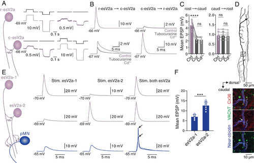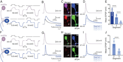 esV2a interneurons drive ipsilateral escape MNs. (A) Dual whole-cell patch-clamp recording from an esV2a interneuron and a pMN connected via bidirectional electrical coupling. (B) Stimulation of the esV2a interneuron induced monosynaptic EPSPs in the pMN whose chemical component was blocked by d-tubocurarine, leaving only the Cd2+-insensitive eEPSP. (C) Confocal images showing VAChT (red) expressing at the crossing site (white arrow) between the axon of the esV2a interneuron (dashed line) and the pMN (blue); same neurons as in B. The green channel is the same as the blue channel and represents a pseudocoloring of neurobiotin filled neurons for better visibility. (D) The EPSP amplitude was highest in the pMN in the same segment as the esV2a interneuron and decreased in more caudal segments. (E) Quantification of the mean EPSP amplitude based on the segmental location of the pMNs relative to the recorded esV2a interneuron (each bar represents mean ± SD, segment 1: n = 16; segment 2: n = 15; segment 3: n = 12; one-way ANOVA, P = 2 × 10−5 for segment 1 vs. segment 2; P = 0.5 × 10−6 for segment 2 vs. segment 3). Each dot represents the data from single neurons. (F) Dual whole-cell patch-clamp recording between an esV2a interneuron and a fMN showing bidirectional electrical coupling. (G) Single action potential in an esV2a interneuron induced an action potential in a caudal fMN that was blocked by d-tubocurarine leaving only an eEPSP that was unaffected by Cd2+. (H) Confocal images showing VAChT (red) expressing at the crossing site (white arrow) between the axon of the esV2a interneuron (dashed line) and the fMN (blue); same neurons as in G. The green channel is the same as the blue channel and represents a pseudocoloring of neurobiotin filled neurons for better visibility. (I) The EPSP in fMN in the same segment as the esV2a interneuron was highest and reached firing threshold, and it decreased in fMNs located in more caudal segments. (J) Quantification of the mean EPSP amplitude amplitude based on the segmental location of the fMNs relative to the recorded esV2a interneuron (each bar represents mean ± SD, segment 1: n = 15; segment 2: n = 10; segment 3: n = 9; paired t test, P = 0.3 × 10−5 for segment 2 vs. segment 3). EPSPs in fMNs in segment 1 could not be quantified because they were always suprathreshold. Each dot represents the data from a single neuron. |
