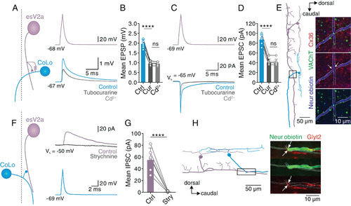 Feedforward excitation and inhibition between esV2a interneurons and CoLo interneurons, respectively. (A) Dual whole-cell patch-clamp recording from a rostral esV2a interneuron and an ipsilateral caudal CoLo interneuron (the dashed line indicates the middle line of spinal cord). esV2a interneurons made mixed electrical and chemical synapses with CoLo interneurons. (B) Quantification of the mean amplitude of monosynaptic EPSPs in CoLo interneurons. The graph shows mean ± SD, n = 7; one-way ANOVA, P = 7.5 × 10−5 for control vs. d-tubocurarine; P > 0.05 for d-tubocurarine vs. Cd2+. (C) The same pair of esV2a interneuron and CoLo interneuron as in A in which EPSCs were examined. (D) Quantification of the mean amplitude of the monosynaptic EPSCs elicited in CoLo interneurons. Graph represents mean ± SD, n = 7; one-way ANOVA, P = 8.2 × 10−5 for control vs. d-tubocurarine; P > 0.05 for d-tubocurarine vs. Cd2+. Each dot represents the data from single neurons. (E) Reconstruction of a recorded esV2a interneuron and CoLo interneuron (Left). Confocal image showing the coexpression of VAChT (green) and Cx36 (red and indicated by white arrows) at the site of synaptic contacts between the axons of the two interneurons (blue and indicated by the dashed lines). These images correspond to the region indicated in the box of the Left panel. (F) Dual whole-cell patch-clamp recording of an esV2a interneuron and a contralateral CoLo interneuron (the dashed line indicates the middle line of spinal cord). Single action potentials in CoLo interneuron elicited IPSCs in esV2a interneuron that were blocked by strychnine. (G) Quantification of the effect of strychnine on the mean amplitude of monosynaptic IPSCs. Data are presented as mean ± SD, n = 6; paired t test, P = 6.3 × 10−7. Each dot represents the data from a single neuron. (H) Lateral view of the reconstruction of the pair of CoLo and esV2a interneuron shown in F. GlyT2 was expressed at the site of presumed synaptic contact between CoLo and esV2a interneuron axon (arrows). |
